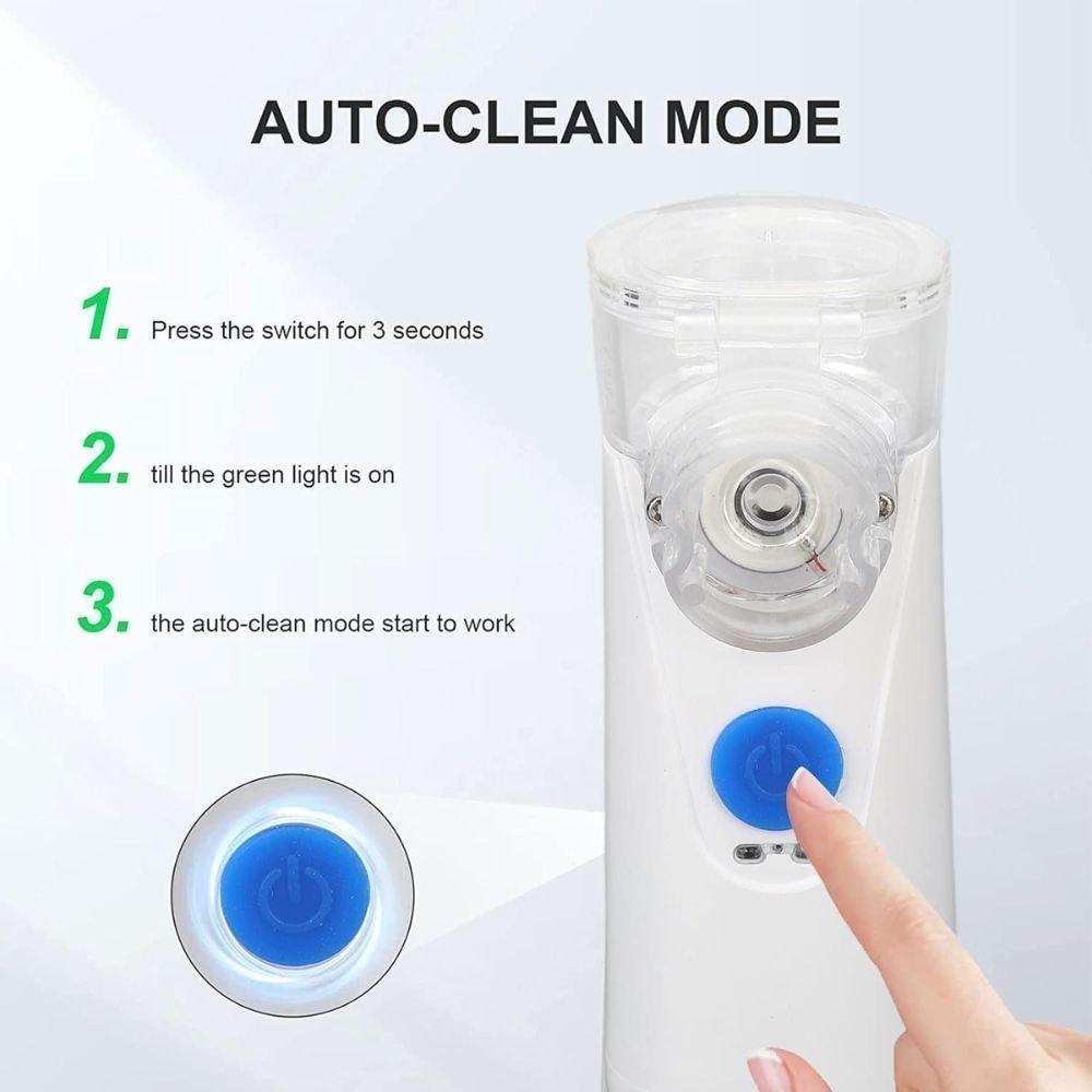 καθαρισμός: Αυτόματη απενεργοποίηση μετά την απουσία υγρών στο κύπελλο. Ο νεφελοποιητής είναι επίσης εξοπλισμένος με λειτουργία αυτόματου καθαρισμού, απλώς αφαιρέστε τα εξαρτήματα, ρίξτε τα υπολείμματα και προσθέστε μια κατάλληλη ποσότητα ιατρικού αλκοόλ ή νερού και, στη συνέχεια, πατήστε το κουμπί για