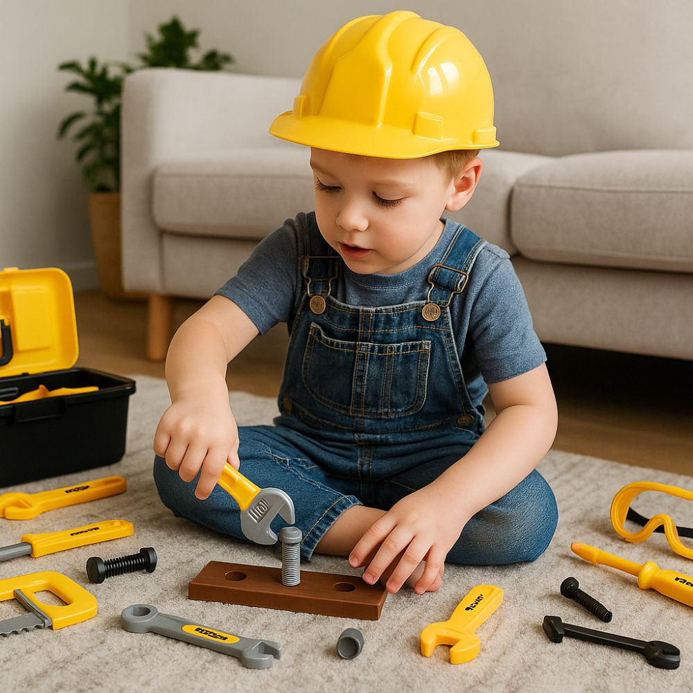 Το σετ περιλαμβάνει ρεαλιστικά παιχνίδια-εργαλεία, όπως κατσαβίδι, παξιμάδι, πριόνι και άλλα εξαρτήματα, που βοηθούν το παιδί να εξοικειωθεί με τον κόσμο των κατασκευών μέσω παιχνιδιού ρόλων. Η ανθεκτική πλαστική βαλίτσα διατηρεί όλα τα κομμάτια οργανωμένα και επιτρέπει εύκολη μεταφορά στο σπίτι, στη βόλτα ή στις διακοπές.