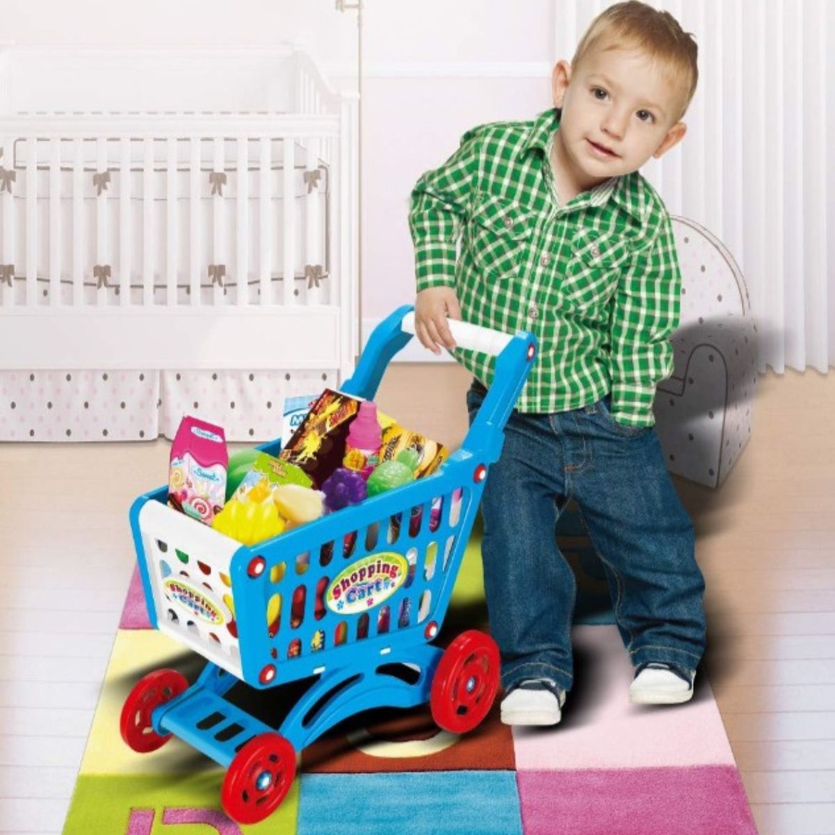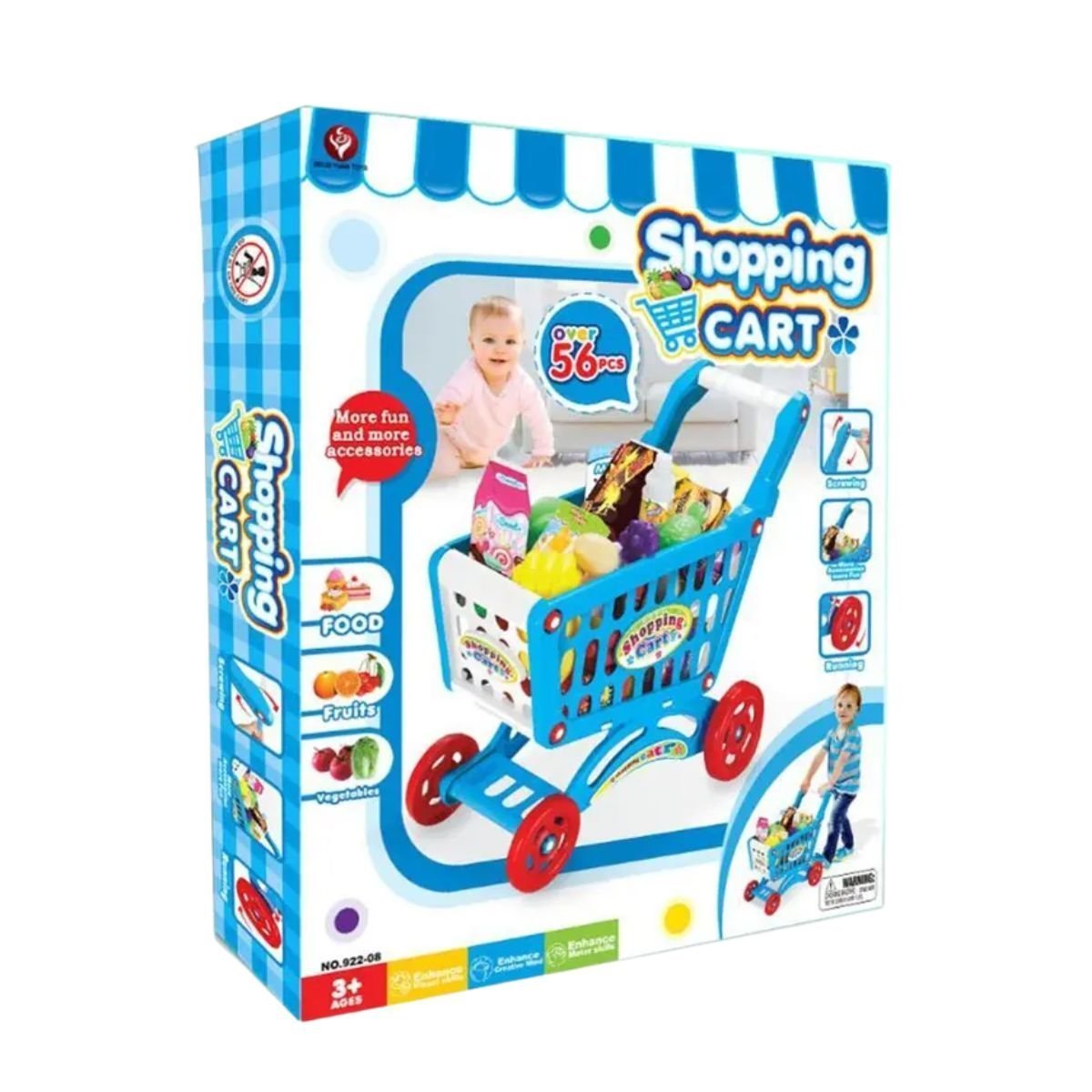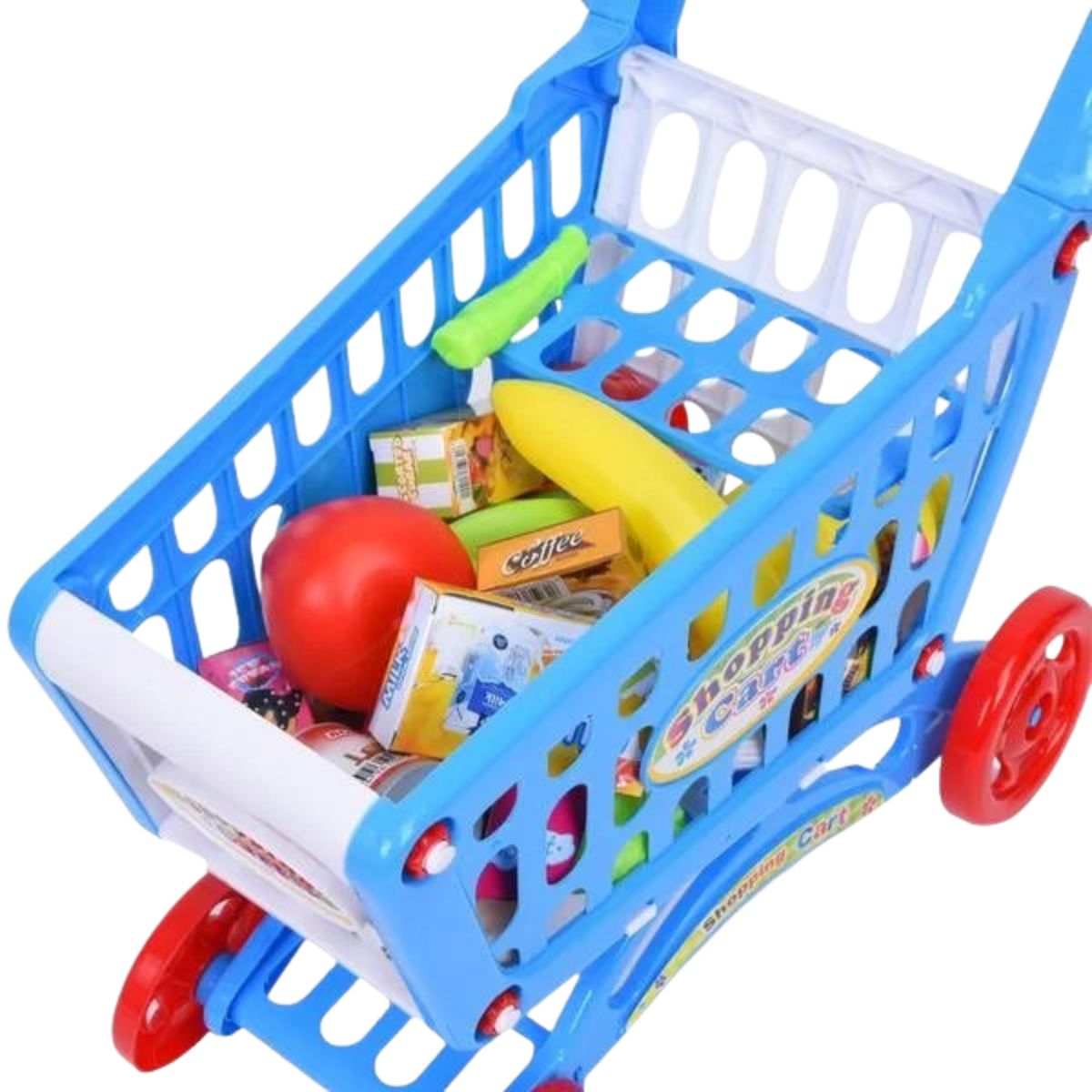 Το καρότσι διαθέτει ανθεκτική κατασκευή με εργονομική λαβή και ρόδες για εύκολη μετακίνηση, ενώ το πλήρες σετ περιλαμβάνει φρούτα, λαχανικά, συσκευασίες τροφίμων και αξεσουάρ που προσφέρουν ατελείωτες ώρες διασκέδασης και μάθησης.