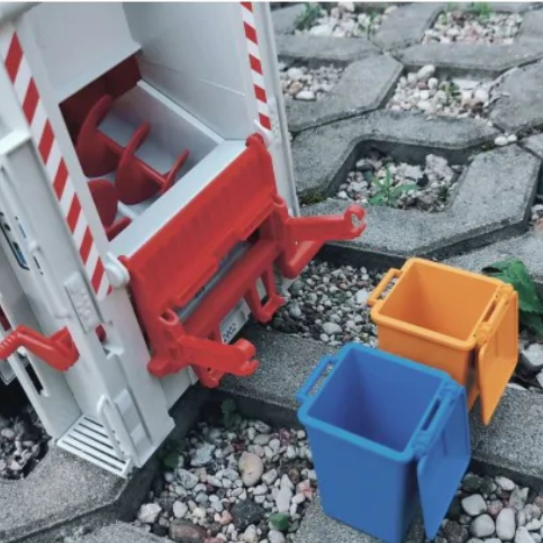 δύο αποσπώμενους κάδους απορριμμάτων, οι οποίοι μπορούν να ανασηκωθούν και να αδειάσουν στον πίσω μηχανισμό φόρτωσης, ενώ ο κάδος συλλογής στο πίσω μέρος ανοίγει για την εκκένωση. Με προσοχή στη λεπτομέρεια και κατασκευή υψηλής αντοχής, είναι ιδανικό για καθημερινό παιχνίδι σε κάθε περιβάλλον.